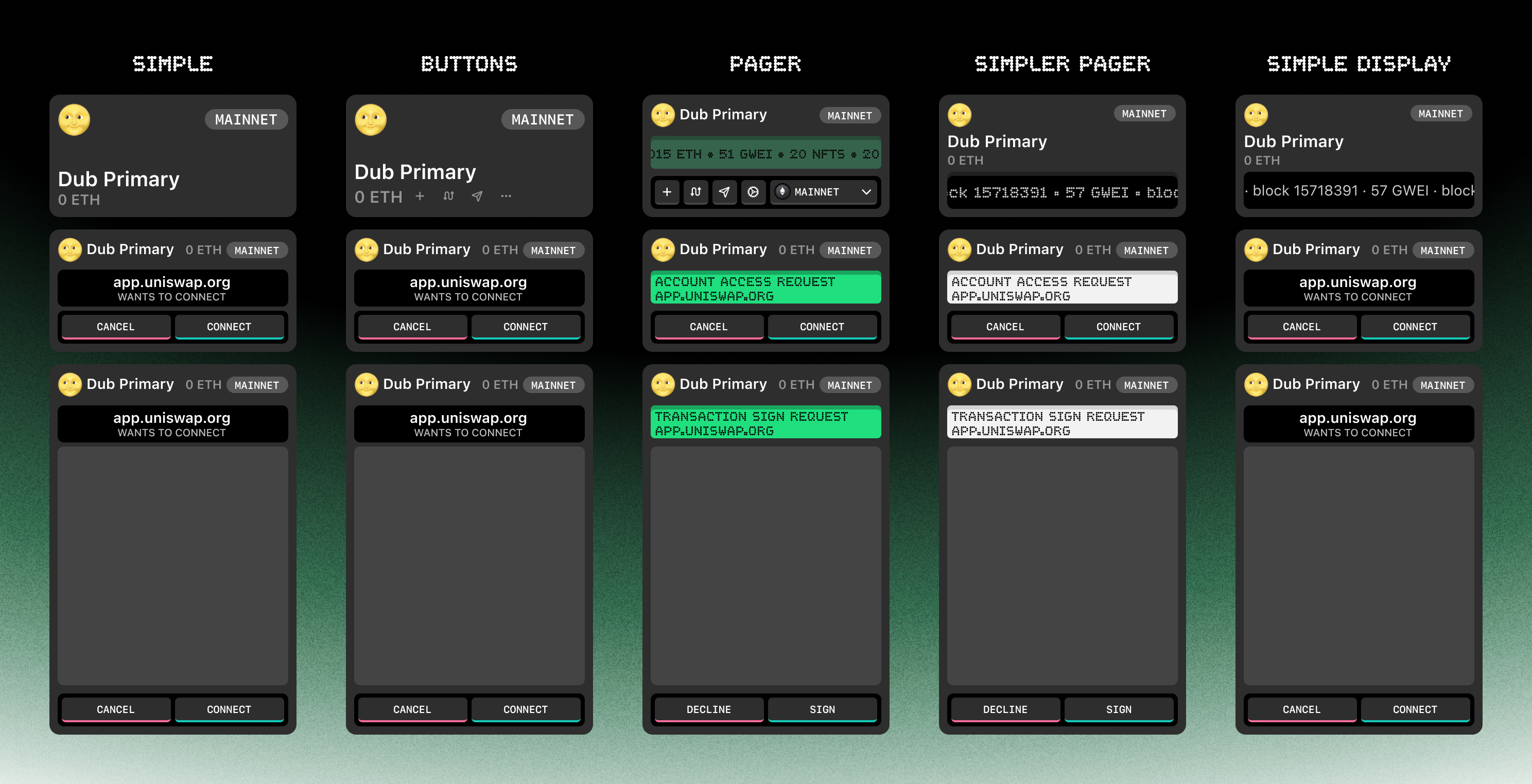 While Dub isn’t a mobile app (yet) and thus we do not have a Dynamic Island to play with, we are toying with the concept of the Dynamic Wallet: a wallet component that changes fluidly depending on the context. For instance, the condensed wallet size could have a standard view that simply contains identifying information for your active wallet (icon, name, native token balance, currently connected network). More excitingly, that same condensed wallet size could morph into a request view to display real-time wallet requests (like account access / connections, personal signatures, and transaction signatures). (see below)